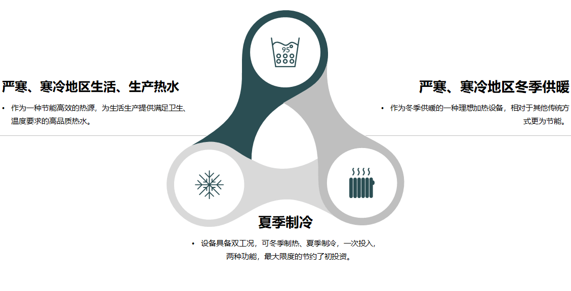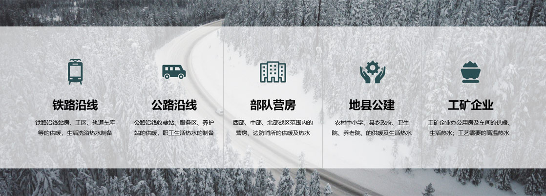 在嚴(yán)寒和寒冷地區(qū)作為集中供暖的補(bǔ)充方式,主要應(yīng)用在項(xiàng)目偏僻,無法接入城市熱網(wǎng)、氣網(wǎng),但在冬季任然需要供暖的中小型項(xiàng)目