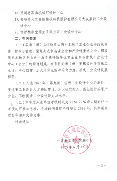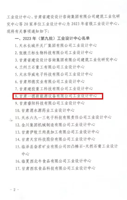 6月27日,甘肅省工信廳公布了2023年(第九批)省級工業(yè)設(shè)計中心名單,白銀高新區(qū)企業(yè)甘肅一德新能源設(shè)備有限公司成功獲批省級工業(yè)設(shè)計中心。截止目前,白銀高新區(qū)已累計認定省級工業(yè)設(shè)計中心5家。